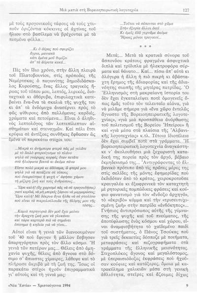 Είναι ένα γνωστό πια παγκόσμιο φαινόμενο όλη αυτή η ιστορία της πολιτικοποιημένης λογοτεχνίας. Ομως και σ' αυτές τις δύσκολες και δυσμενείς καταστάσεις γράφτηκε καλή λογοτεχνία, προπαντός ποίηση και πεζογραφία.